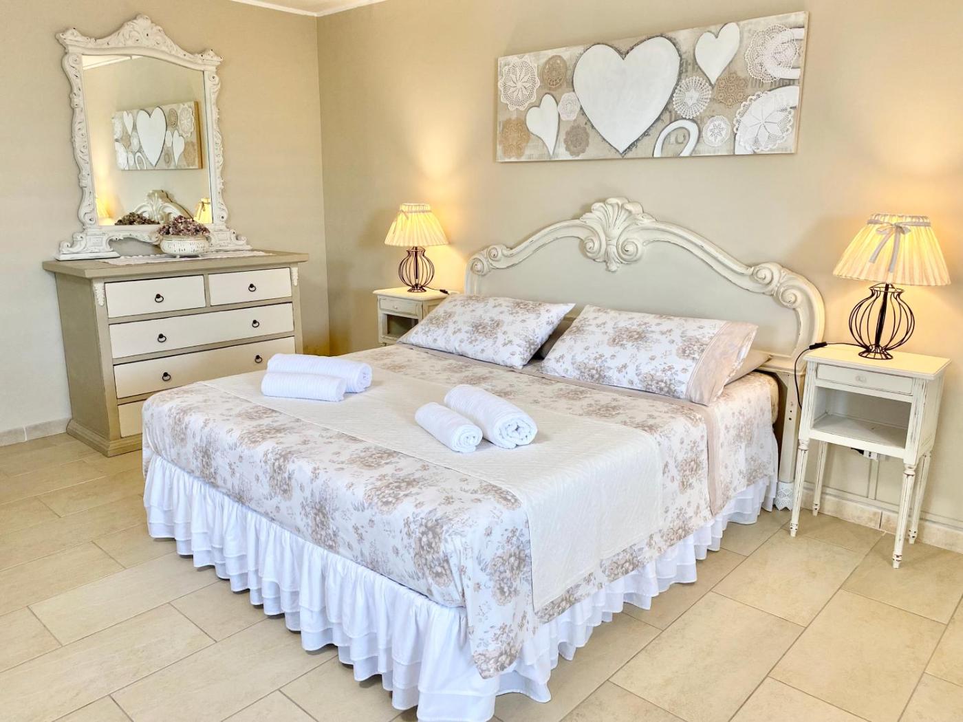 L appartamento, arredato finemente in stile shabby chic, si compone di: camera da letto matrimoniale climatizzata con armadio e letto singoloculla, area living con tv e poltrone, bagno con doccia.