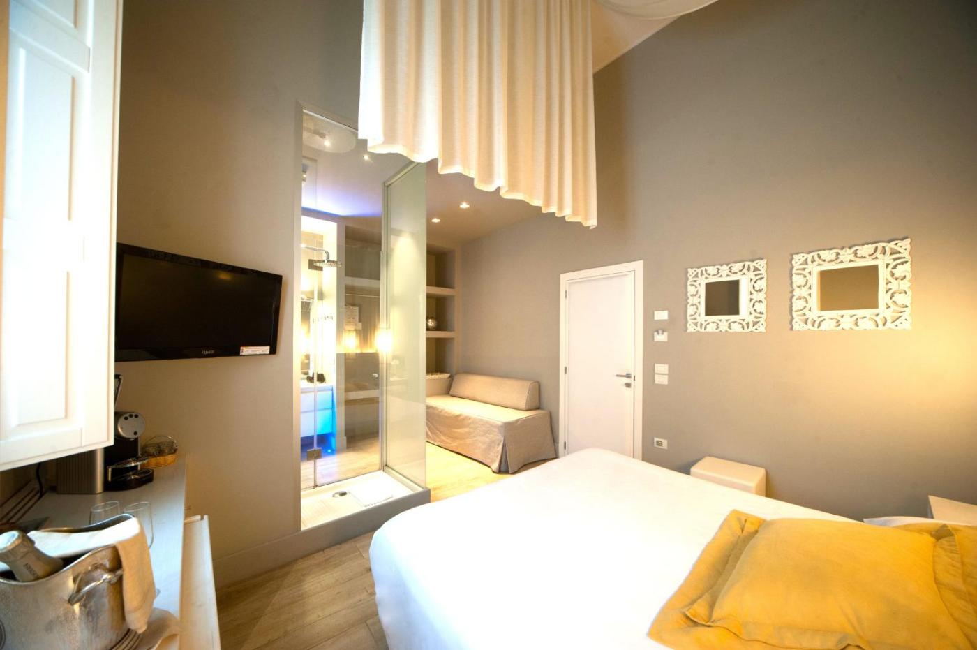 The exclusive flower-themed accommodation of the Corteinfiore offers free WiFi, air conditioning, and a LED TV. The hotel-like rooms are complete with a Lavazza® coffee machine,water, juices and yogurt. Rooms also come with a free minibar.